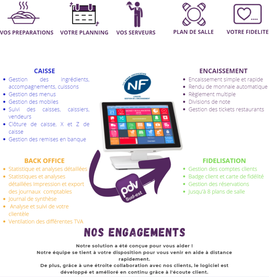 Gestion jusqu'à 8 salles : salon, terrasse, mezzanine, prises de commandes sur un simple téléphone ou tablette (sous android), choix ou modifications des ingrédients, division de notes multi-critères et multi-paiement, programmation tactile simple.